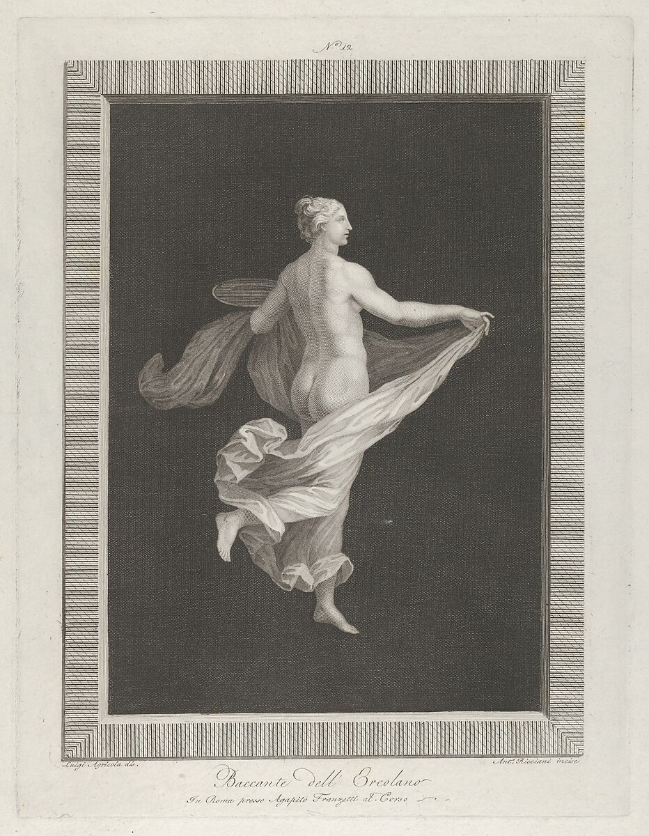 A partly naked bacchante seen from behind, facing right and holding an oval dish in her left hand, her drapery in her right, set against a black background inside a rectangular frame