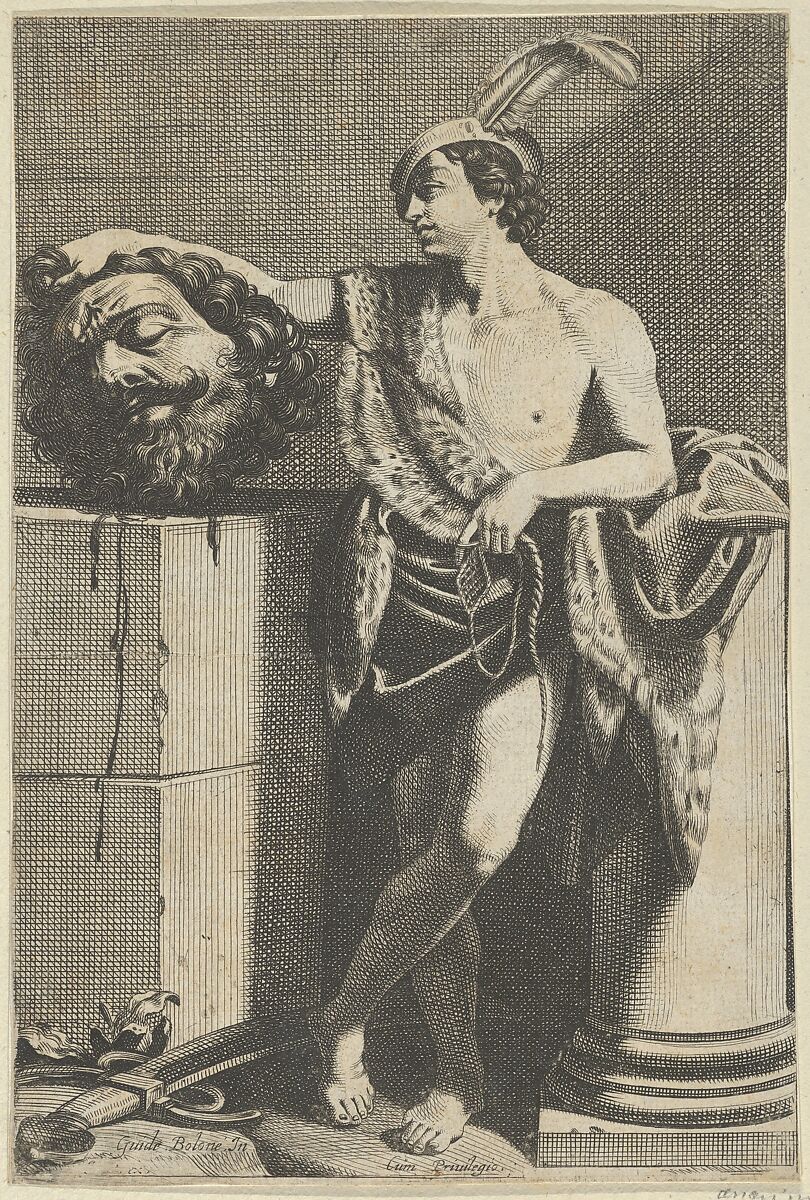 - Title:David standing with crossed legs and holding the head of Goliath on a pedestal at left, a sword on the ground, after Reni