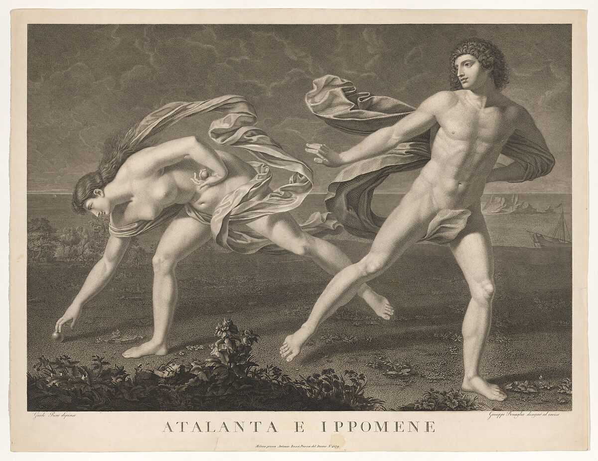 - Title: Atalanta at left picking up the golden apple dropped by Hippomenes at right, after Reni