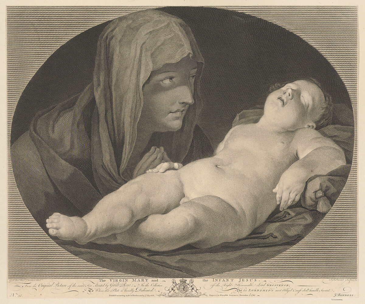 - Title:The Virgin in prayer, looking at the sleeping infant Christ, in an oval frame, after Reni