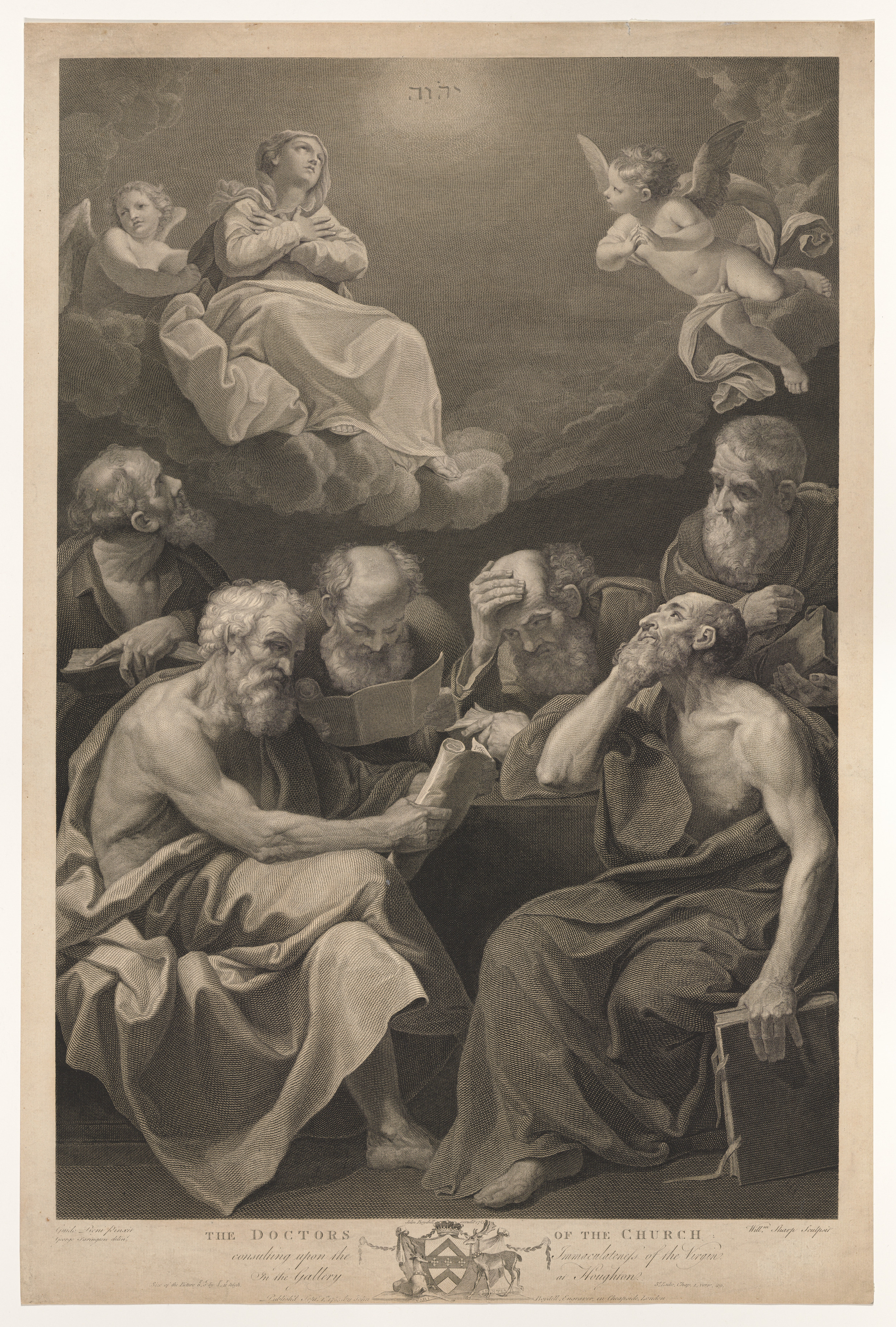 The doctors of the church consulting books and documents and contemplating the Virgin who is shown above in heaven, flanked by angels, after Reni