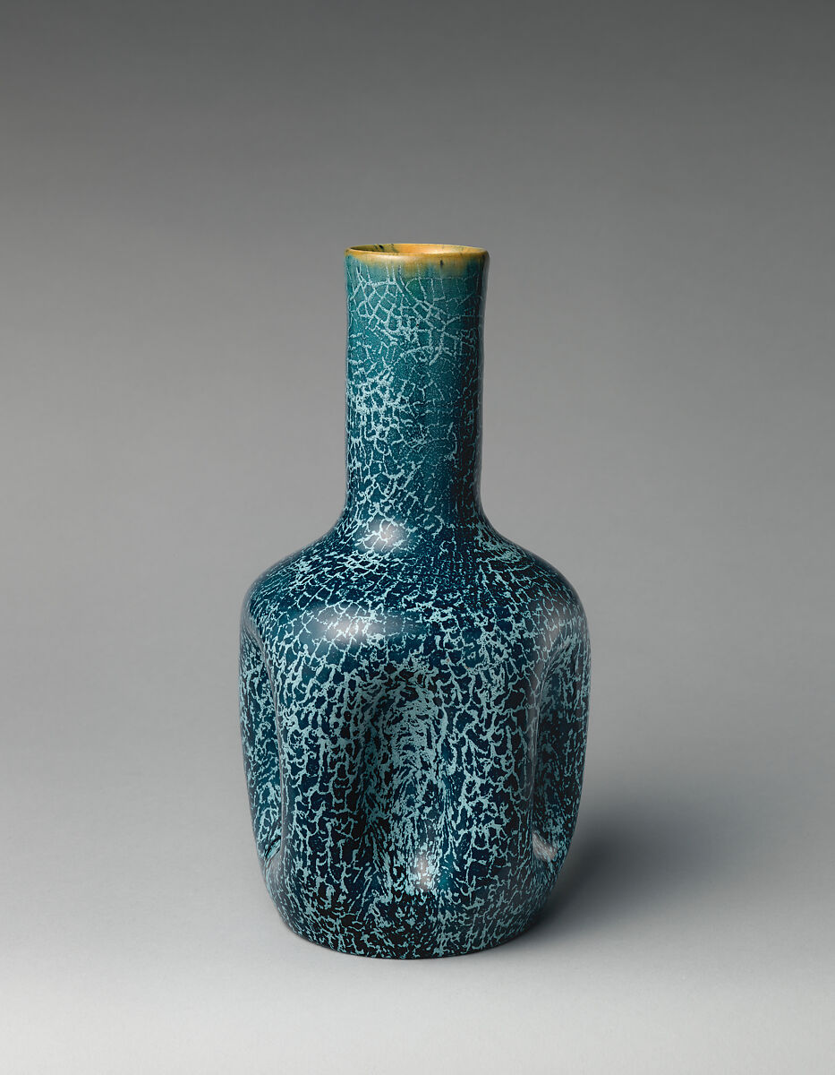 This vase illustrates a shape designed by Christopher Dresser during his partnership with the Linthorpe Pottery Works from 1879 to 1882. The dimpled bottle vase—model number 24—was produced in great numbers, but few have the beautiful and rare crackle glaze of the present vase. It is thought that Linthorpe glazes, particularly the experimental mottled and crackled glazes used by the factory, were the work of the pottery manager, Henry Tooth, while Dresser was responsible for the forms.