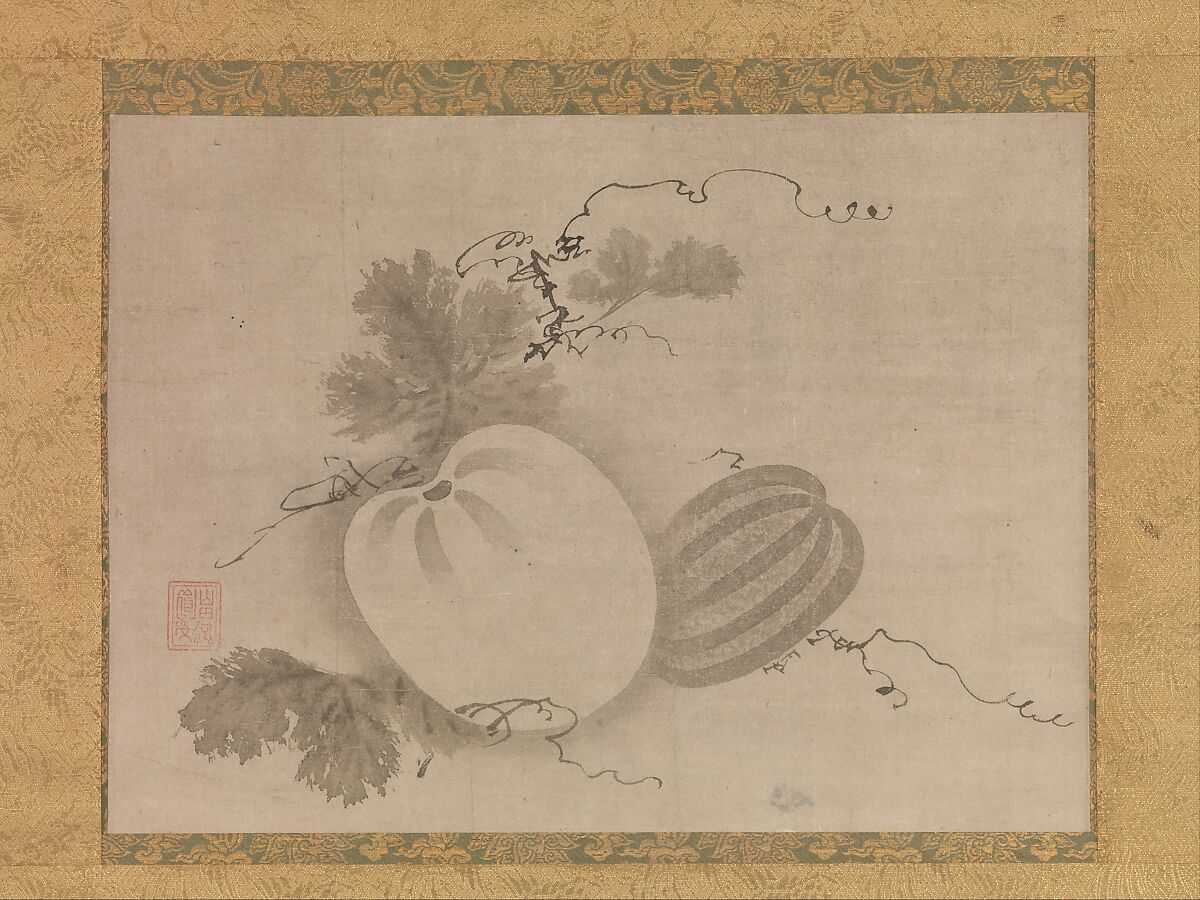 Images of fruits and vegetables were often displayed in Zen temples as symbolic offerings to Buddhist icons. Although similar images were produced earlier in Song dynasty China, ink paintings of isolated fruits or vegetables became popular in Japan during the late Muromachi period, when they were associated with the Chinese Chan (Zen) artist Muqi (ca. 1210–after 1269). A painting of this subject and size could have been displayed at tea gatherings during the summer season.