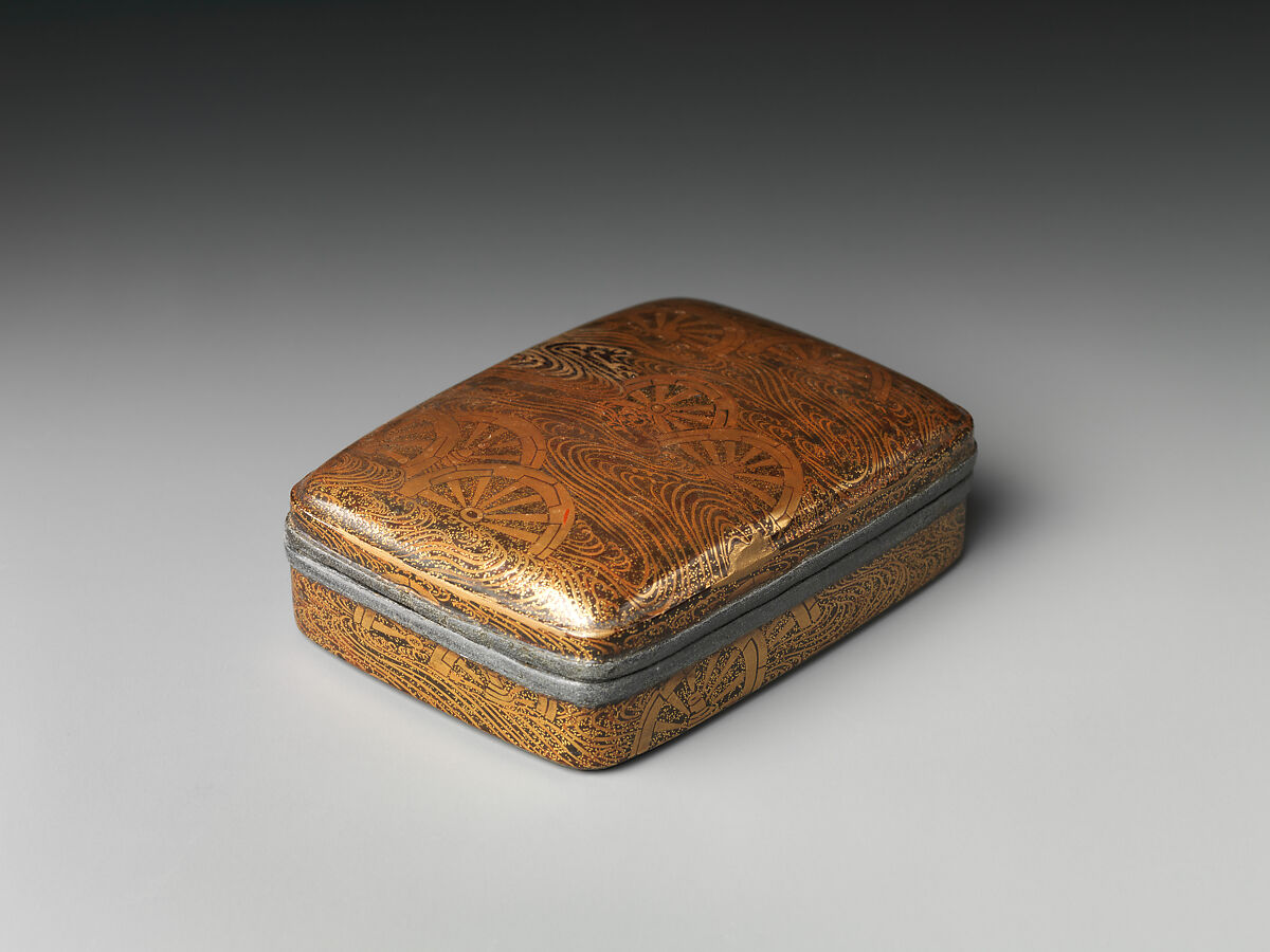 The theme of this small incense box’s design, cartwheels in a stream, reflects the Heian-period (794–1185) practice of soaking the wheels of ox carts in water to prevent them from drying out and cracking. Popular during the Heian period, this pattern is also seen on both mirrors and decorated calligraphy papers used for sutra scrolls. This box was perhaps originally part of a cosmetic set and would have been a container for tooth-blackening material.