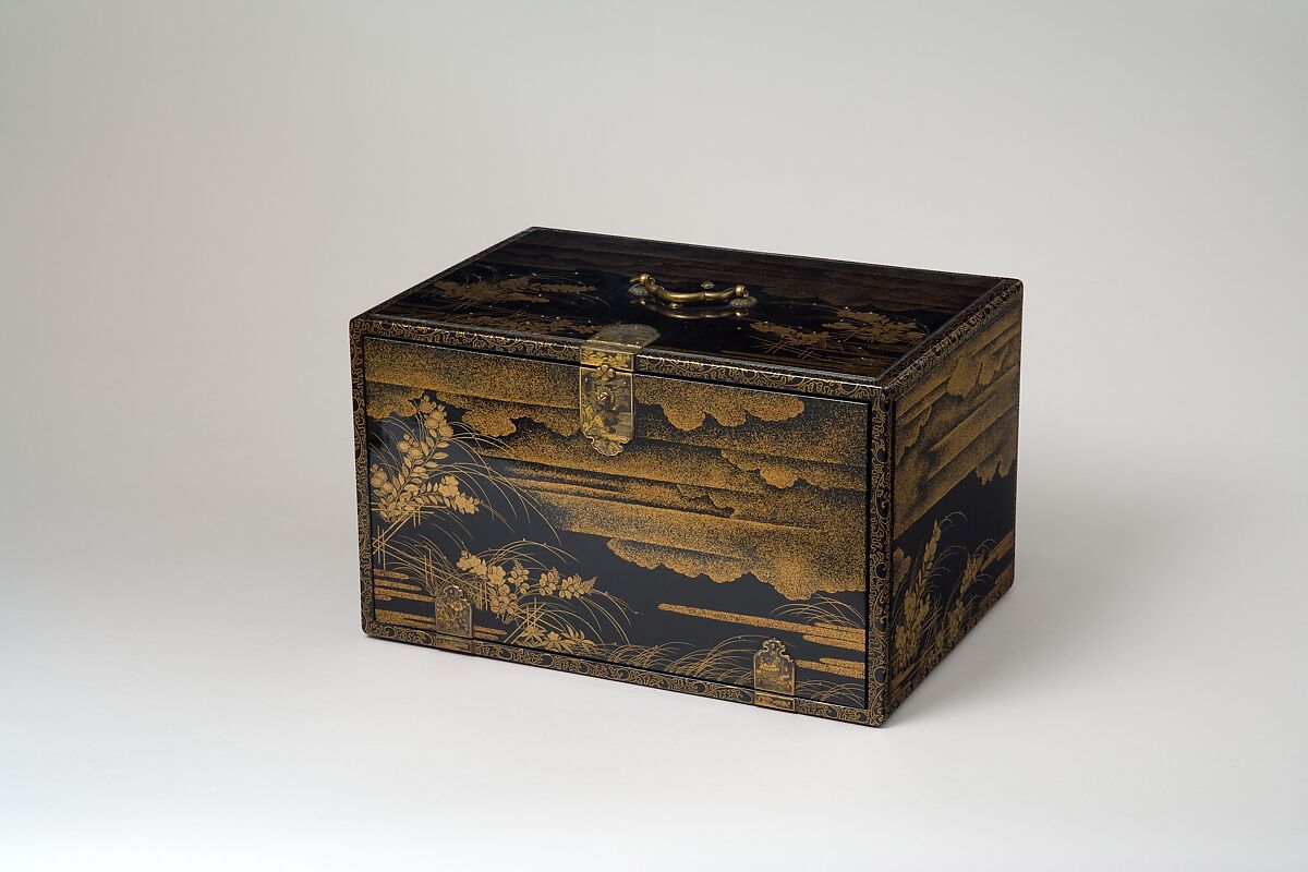 This drop-front cabinet was designed to store the forty-two volumes of the Taiheki, a Japanese historical epic written in the late fourteenth century. It tells the story of Emperor Go-Daigo’s accession in 1318, moves through Ashikaga Takauji’s betrayal of the Hōjō clan and Go-Daigo’s fall and expulsion by Takauji in 1333, and culminates with Go-Daigo’s return to Kyoto in 1338. The cabinet has six drawers, with inscriptions indicating which volume belongs to which drawer. The exterior of the cabinet is decorated with autumn grasses and flowers, further embellished with inlaid silver dewdrops. The upper part of the composition depicts clouds and mist (similar to Japanese painting) executed in very fine togidashimaki-e (burnished “sprinkled picture”) with delicate gradations. The edge of the box has stylized foliage designs.