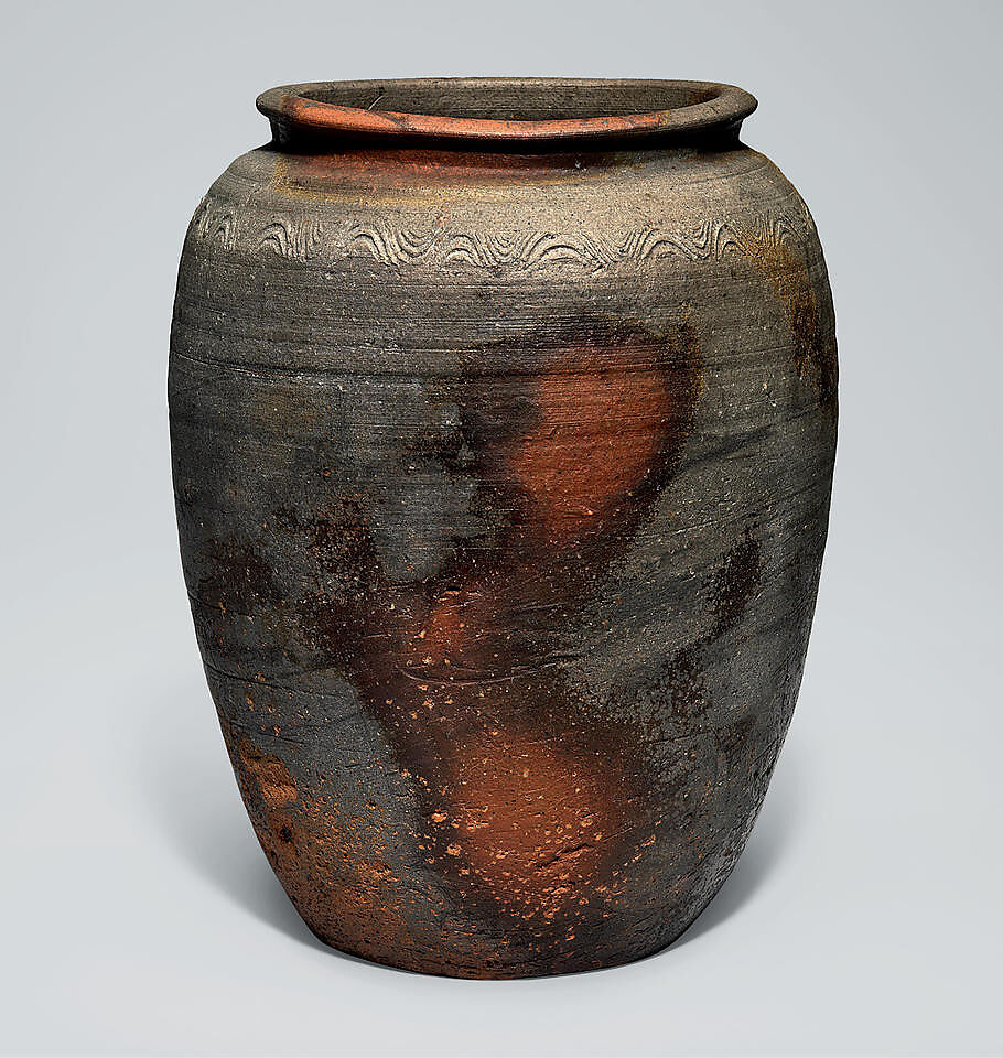A delicately incised, repeating wave pattern graces the shoulder of this widemouthed, unglazed vessel. The placement of the vessel in the wood-burning kiln, combined with the potter’s control of the fire, airflow, and ash caused “kiln transformations” (kamahen) such as the dark reddish patches on the body and lip. Variations in surface color are the result of haphazard contact with wood ash.