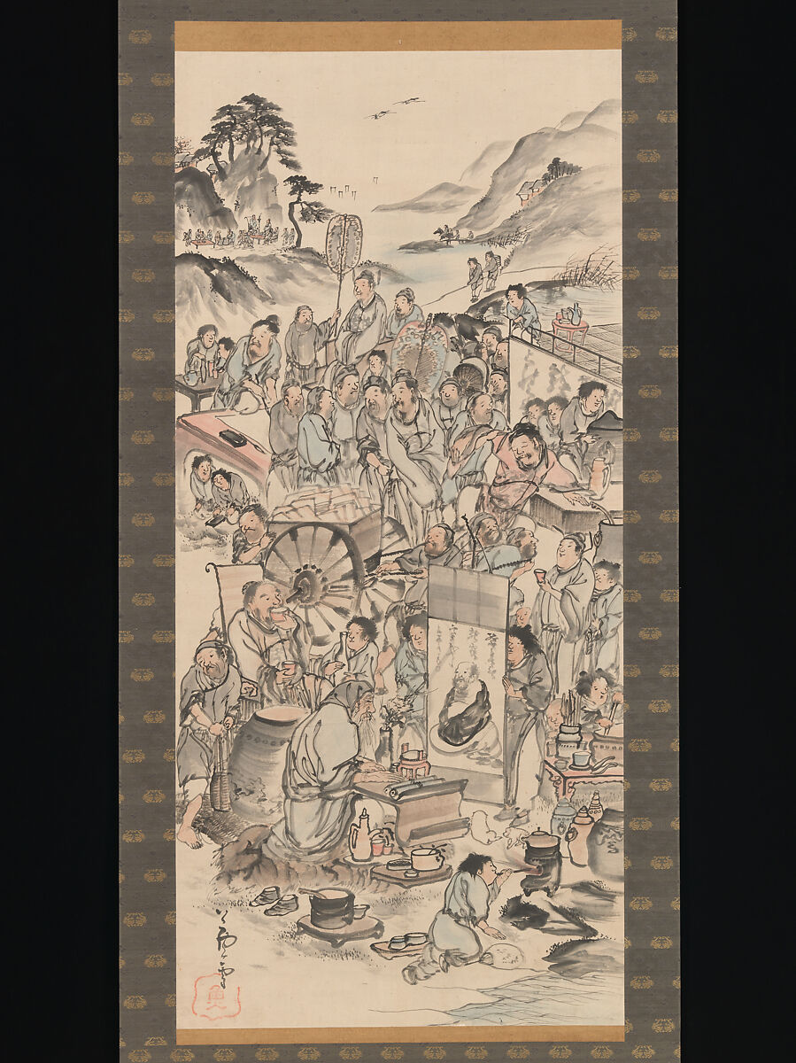 The Tang dynasty poet Du Fu celebrated eight famous drinkers of his age in his poem Eight Immortals of the Wine Cup (Inchū hassenka). In Nagasawa Rosetsu’s playful rendering of this theme, popular with Japanese painters from the late sixteenth century on, the artist has filled his composition with images of the eight drinkers, creating an almost bazaar-like atmosphere. The brushwork in the signature dances a bit compared with his typical style of signing; this could reflect Rosetsu’s harmonizing of his signature with the giddy mood of the painting. Rosetsu was Maruyama Ōkyo’s student and pursued the carefree life of the literati. Hence he was attracted to the unrestrained lives of the individuals shown in this painting.