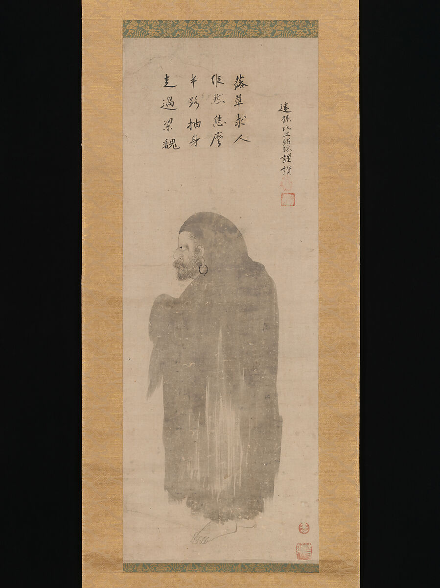 This imagined portrait depicts Bodhidharma, the monk credited with transmitting Zen Buddhism from India to China in the sixth century. The image is inscribed with a poem in Chinese by Gyokuho Jōsō (1546–1613), the 130th abbot of Daitokuji, a major Zen monastery in Kyoto. To accommodate the figure, who faces left, the text is read from left to right; this is atypical for Japanese and Chinese writing but common in devotional paintings, where the direction of the text often responds to the orientation of the figure. The poem celebrates Bodhidharma’s early efforts to spread Zen in China: