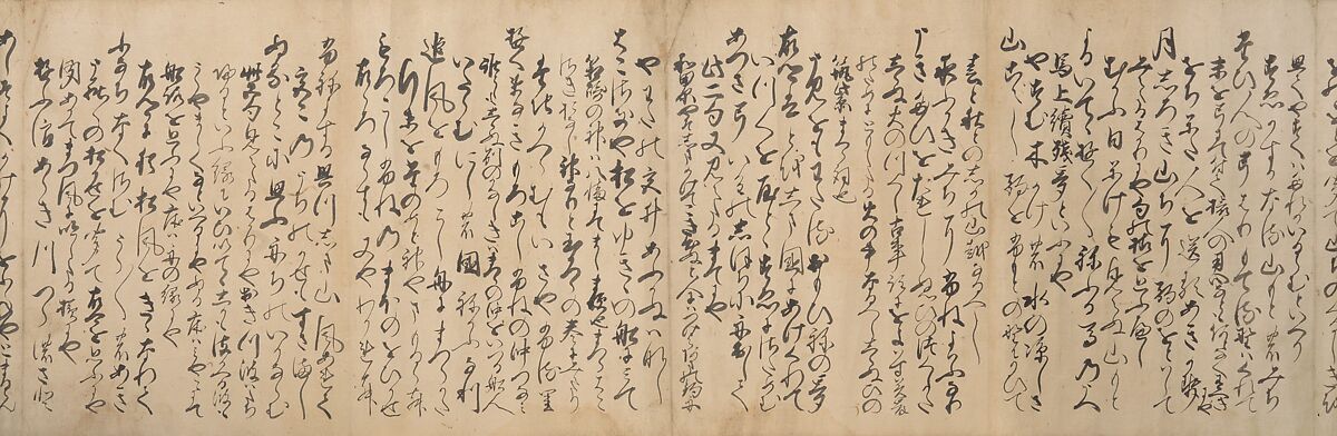 This scroll of elegant but forceful calligraphy comprises the “Travel” (Tabi) section of the “Aged Leaves” (Wakuraba) poetry anthology, compiled by the great medieval poetry master Sōgi (1421-1502). The type of verse transcribed here is a special kind of linked verse (renga), in which the first three lines of the verse is composed by one poet, and the final two lines by another poet. During an age when printing was still rare, students of poetry had to make their own transcriptions of anthologies for study. Little is known about the calligrapher here, who signed himself Ryūkō, except that he was a renga poet of the Warring States period, who was active in Yamashiro in Kyoto and also the Mizokui district of Settsu (Osaka). Ryūkō was a pupil of the renga master Shōhaku 肖柏 (1443–1527), who had received training from Sōgi, so we can retrace the transmission of this manuscript over three generations.