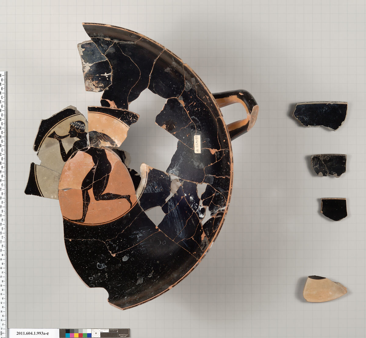 Interior, in black figure, a wreathed youth with a drinking horn in his right hand; Obverse, between eyes, nose, at the handle, a palmette; Reverse, handle palmette, part of left eye; three other rim fragments; two fragments of the foot