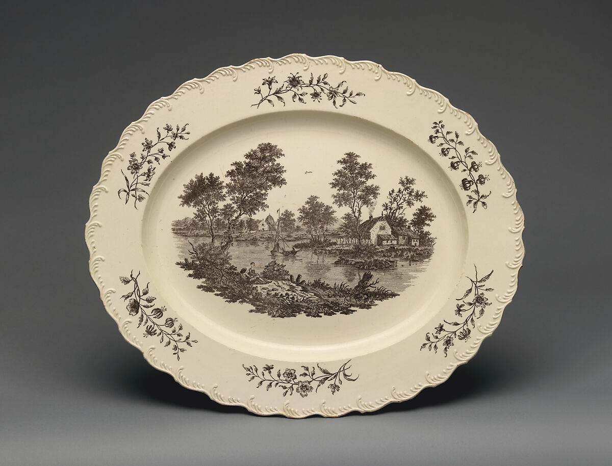 This platter represents two great inventions of British potters in the eighteenth century: creamware, a durable white earthenware with yellowish glaze, and transfer-printing, a technique that allowed for high-quality decoration at a relatively low cost. Creamware was developed by Staffordshire potters around 1750 as a substitute for porcelain. Lightweight, yet durable, it proved ideal for moderately-priced domestic wares. Josiah Wedgwood achieved commercial success in producing creamware of elegant designs often with transfer-printed decoration. After gaining the patronage of Queen Charlotte, Wedgwood was allowed to use the name Queen’s ware.