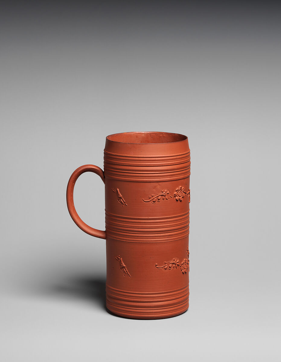 The Elers brothers, John Philip and older brother David, were Dutch born silversmiths who came to London in the 1680s. They produced pottery at Bradwell Wood, in Staffordshire, for a brief period between ca. 1690 and 1698, creating high quality unglazed red stoneware. The Elers brothers were pioneers in the rise of the salt-glazed stoneware industry in Staffordshire. The mug demonstrates the high quality and elegant design characteristic of the Elers’ stoneware production. The fine color is indicative of the native clay deposits in Staffordshire, the reason the Elers and many others established pottery works in the region. The unglazed red stoneware is inspired in part by Chinese Yixing wares, imported by the Dutch East India Company and widely imitated by Dutch and English potters.