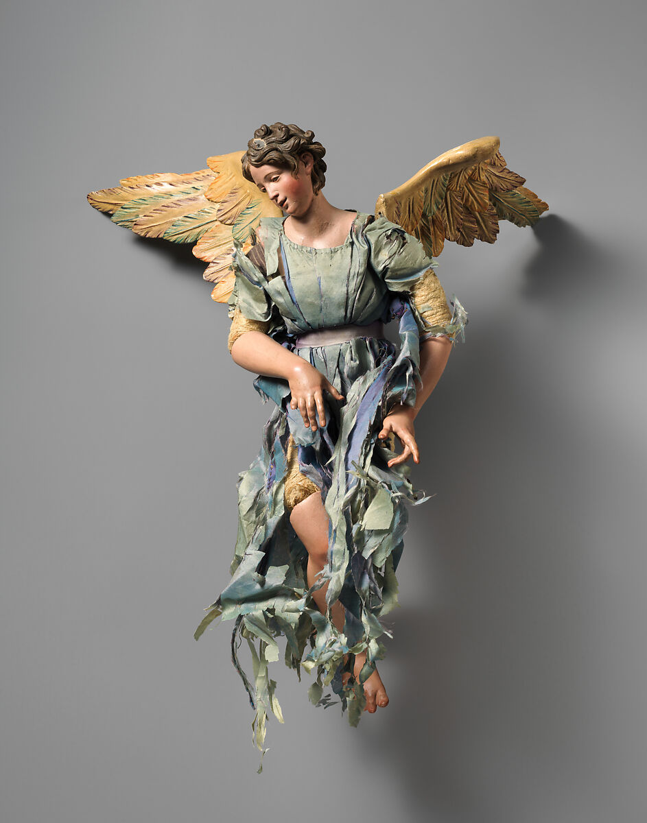 The practice of using crèche figures to restage religious events reached the height of its complexity and artistic excellence in eighteenth-century Naples, and the Metropolitan Museum of Art’s group of Neapolitan crèche is one of the finest and most complete survivals of the art form. The ensemble consists of characters traditional to eighteenth-century Italian Christmas holiday customs. The Nativity, featuring the holy family, shepherds and their flocks, and a host of angels and cherubs is joined by the procession of the three Magi, townspeople, colorful peasants, individuals from the Mediterranean shores, and animals. The figures have articulated bodies of tow and wire with polychromed terracotta heads, and are all in partially distressed condition.