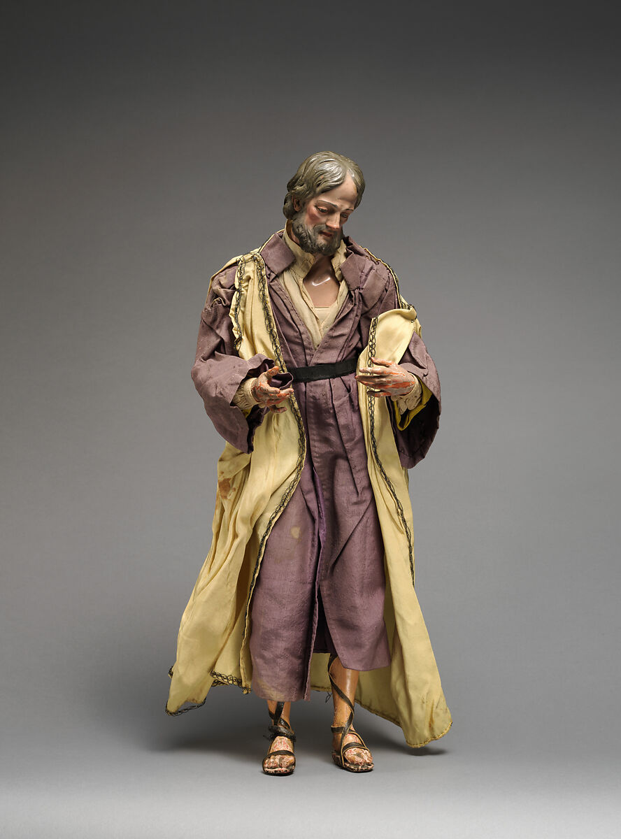 The practice of using crèche figures to restage religious events reached the height of its complexity and artistic excellence in eighteenth-century Naples, and the Metropolitan Museum of Art’s group of Neapolitan crèche is one of the finest and most complete survivals of the art form. The ensemble consists of characters traditional to eighteenth-century Italian Christmas holiday customs. The Nativity, featuring the holy family, shepherds and their flocks, and a host of angels and cherubs is joined by the procession of the three Magi, townspeople, colorful peasants, individuals from the Mediterranean shores, and animals. The figures have articulated bodies of tow and wire with polychromed terracotta heads, and are all in partially distressed condition.