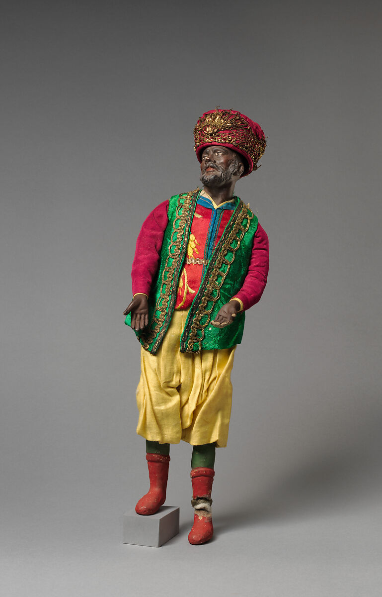 The practice of using crèche figures to restage religious events reached the height of its complexity and artistic excellence in eighteenth-century Naples, and the Metropolitan Museum of Art’s group of Neapolitan crèche is one of the finest and most complete survivals of the art form. The ensemble consists of characters traditional to eighteenth-century Italian Christmas holiday customs. The Nativity, featuring the holy family, shepherds and their flocks, and a host of angels and cherubs is joined by the procession of the three Magi, townspeople, colorful peasants, individuals from the Mediterranean shores, and animals. The figures have articulated bodies of tow and wire with polychromed terracotta heads, and are all in partially distressed condition.