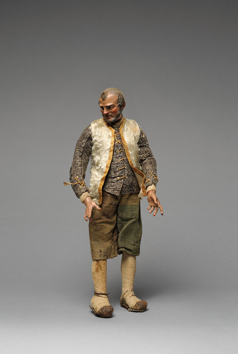 The practice of using crèche figures to restage religious events reached the height of its complexity and artistic excellence in eighteenth-century Naples, and the Metropolitan Museum of Art’s group of Neapolitan crèche is one of the finest and most complete survivals of the art form. The ensemble consists of characters traditional to eighteenth-century Italian Christmas holiday customs. The Nativity, featuring the holy family, shepherds and their flocks, and a host of angels and cherubs is joined by the procession of the three Magi, townspeople, colorful peasants, individuals from the Mediterranean shores, and animals. The figures have articulated bodies of tow and wire with polychromed terracotta heads, and are all in partially distressed condition.