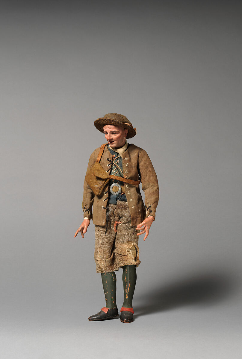 The practice of using crèche figures to restage religious events reached the height of its complexity and artistic excellence in eighteenth-century Naples, and the Metropolitan Museum of Art’s group of Neapolitan crèche is one of the finest and most complete survivals of the art form. The ensemble consists of characters traditional to eighteenth-century Italian Christmas holiday customs. The Nativity, featuring the holy family, shepherds and their flocks, and a host of angels and cherubs is joined by the procession of the three Magi, townspeople, colorful peasants, individuals from the Mediterranean shores, and animals. The figures have articulated bodies of tow and wire with polychromed terracotta heads, and are all in partially distressed condition.
