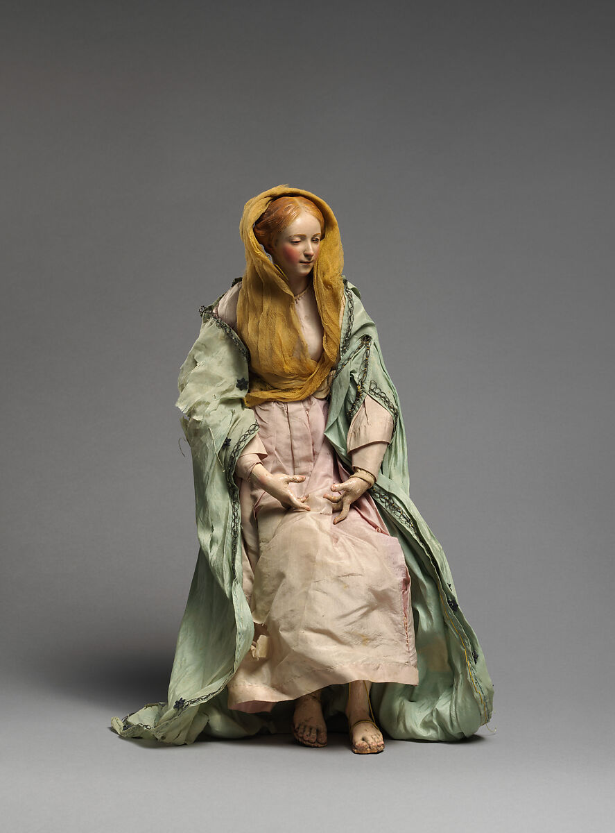 The practice of using crèche figures to restage religious events reached the height of its complexity and artistic excellence in eighteenth-century Naples, and the Metropolitan Museum of Art’s group of Neapolitan crèche is one of the finest and most complete survivals of the art form. The ensemble consists of characters traditional to eighteenth-century Italian Christmas holiday customs. The Nativity, featuring the holy family, shepherds and their flocks, and a host of angels and cherubs is joined by the procession of the three Magi, townspeople, colorful peasants, individuals from the Mediterranean shores, and animals. The figures have articulated bodies of tow and wire with polychromed terracotta heads, and are all in partially distressed condition.
