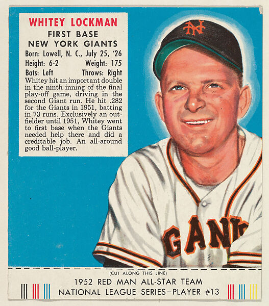 - Title:Whitey Lockman, from the Red Man All-Star Team series (T232), issued by Red Man Chewing Tobacco