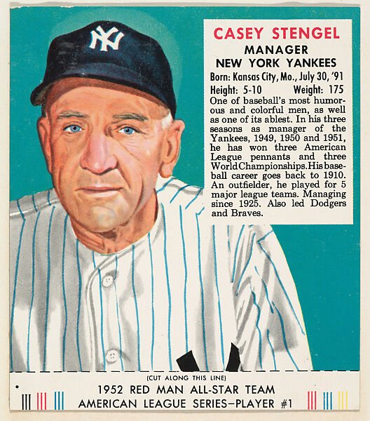 American League Series, Player # 1. Trade card from the "1952 Red Man All-Star Team" series (T232), issued in 1952 by Red Man Chewing Tobacco.