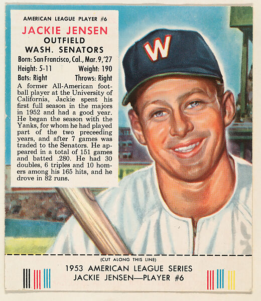 - Title: Jackie Jensen, from the Red Man All-Star Team series (T233), issued by Red Man Chewing Tobacco
