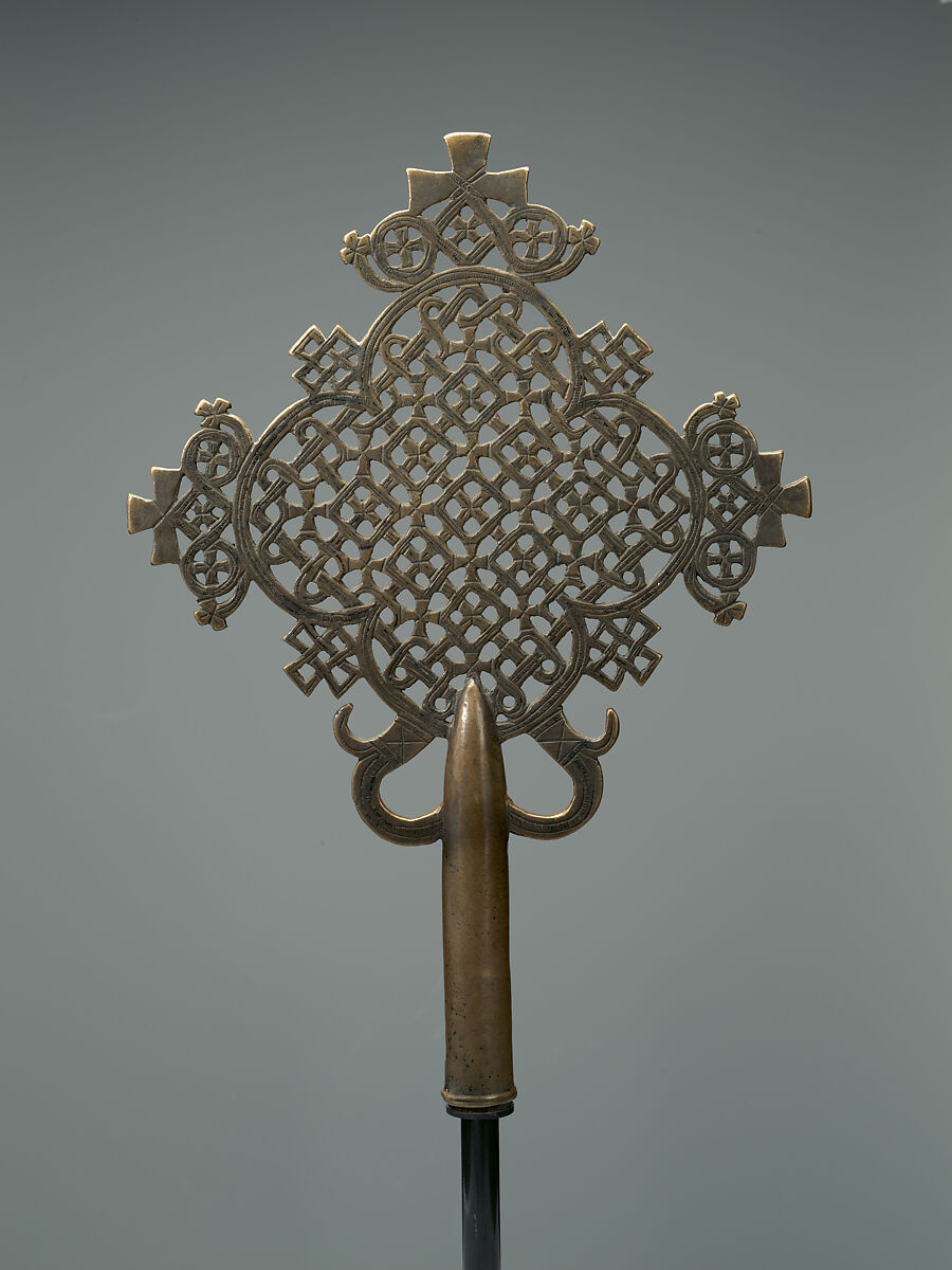 This work is an exceptional example of a popular early 15th century cast copper alloy openwork processional cross developed in Ethiopia -- an art form that has been endlessly reinvented by regional artists. In this example, the ornament is freely worked, while the form is highly symmetrical.