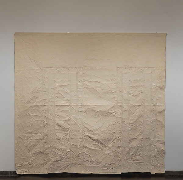 Largely unrecognized during his lifetime, Overby was a multidisciplinary artist and graphic designer whose process-oriented practice prefigured the Postminimalist aesthetic of artists like Rachel Whiteread. Between 1970 and 1972 Overby used concrete, wax, latex, and canvas to create records of architectural spaces and quotidian objects, ranging from an entire living room to a single sock. To produce this work, he first applied latex to a hotel room’s interior wall. Then, using strips of canvas, he traced the wall’s two doorways, ceiling molding, and baseboards onto the cast, creating a to-scale map of the space. The room’s features became less identifiable after the artist transferred them to the canvas, bringing the work to the brink of abstraction. As Overby noted, through this condensed visual language, the "common object [is] seen not as the common object for itself, but by its existence as a form by transfer."