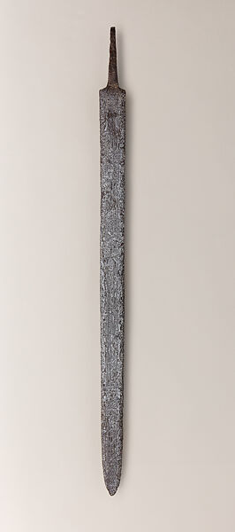 This work of art is currently on loan to the museum.Found at Sittingbourne (in Kent, United Kingdom), this blade's distinctive design is the result of pattern-welding, a technique of forging a blade from stacked and intertwined rods of steel and iron. This produces hard yet flexible blades with complex and varied patterns, treasured for both their strength and beauty.