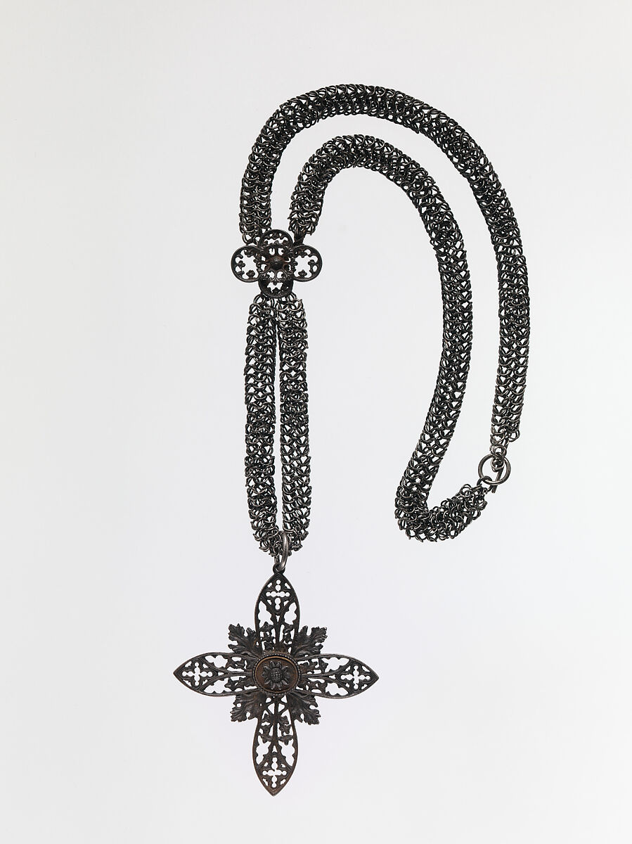 Ironwork jewelry is an important category of nineteenth century jewelry, and this necklace and pendant are among the Museum's finest pieces of Gothic-revival jewelry. While it is likely that this necklace was made in Germany, it is also possible that it was produced in Paris. Germany was the leading center of production for ironwork jewelry, and ateliers elsewhere on the Continent copied German designs. The renewed interest in Gothic art that occurred in the early nineteenth century influenced the production of jewelry, and the medium of iron was well suited to the lacy yet austere Gothic-revival designs, as exemplified by this tracery cross.