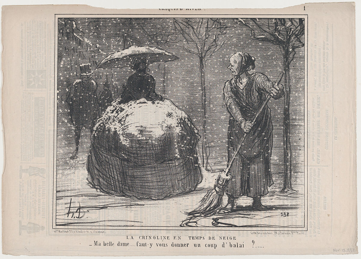 - Title: La crinoline en temps de neige, from Croquis d'Hiver, published in Le Charivari, November 13, 1858