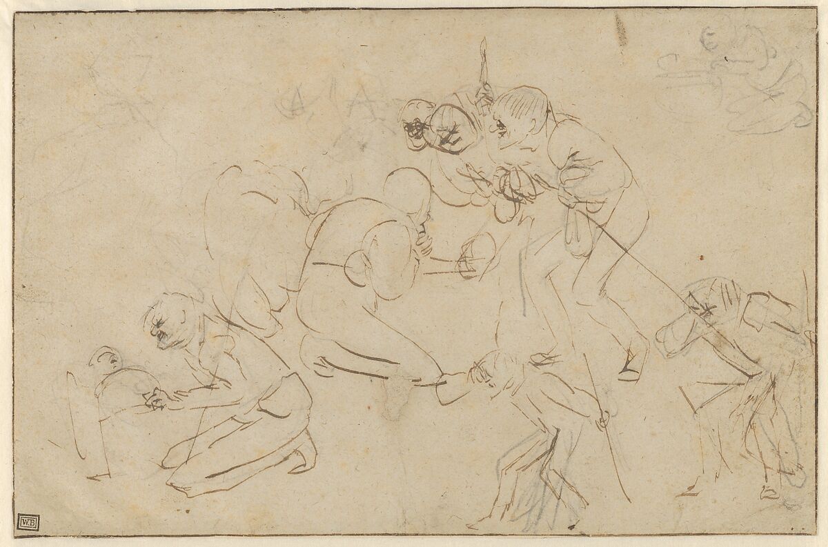 Although no such picture by his hand survives, Brouwer, on this working sheet, explored solutions for an Adoration of the Shepherds. Lively figure studies in black chalk, some of them reworked in pen and ink, cover the page. Occupying the middle part of the sheet is a rendering of the entire figural group. At its center is the Christ Child; his profile is summarily indicated with a few quick pen strokes, which overlap with two diagonal lines—the leg of one of the shepherds—and two horizontal strokes—the top of the cradle. Gazing down at the infant are three crouching figures, one of whom holds a staff and a candle. Two other heads, left only roughly indicated in black chalk, appear to the left of this trio. Below them, another man kneels before the cradle, his right hand raised in a gesture of awe. To his left, the bulky form of an ox can be discerned. At lower right, Brouwer drew two additional versions of the stooped man with the candle, trying out different arrangements of the legs, arms, and staff. He also considered, with the sketches in the upper right and lower left corners, a kneeling figure in profile, facing left, with the Christ Child repositioned accordingly. Finally, at upper left, a man with a hat sits with his back toward the viewer, his head turned to the left.