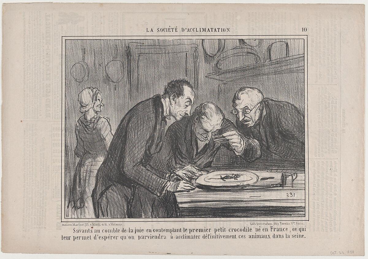 - Title: Savants au comble de la joie en contemplant le premier petit crocodile né e France..., from La Société d'Acclimatations, published in Le Charivari, October 23, 1858