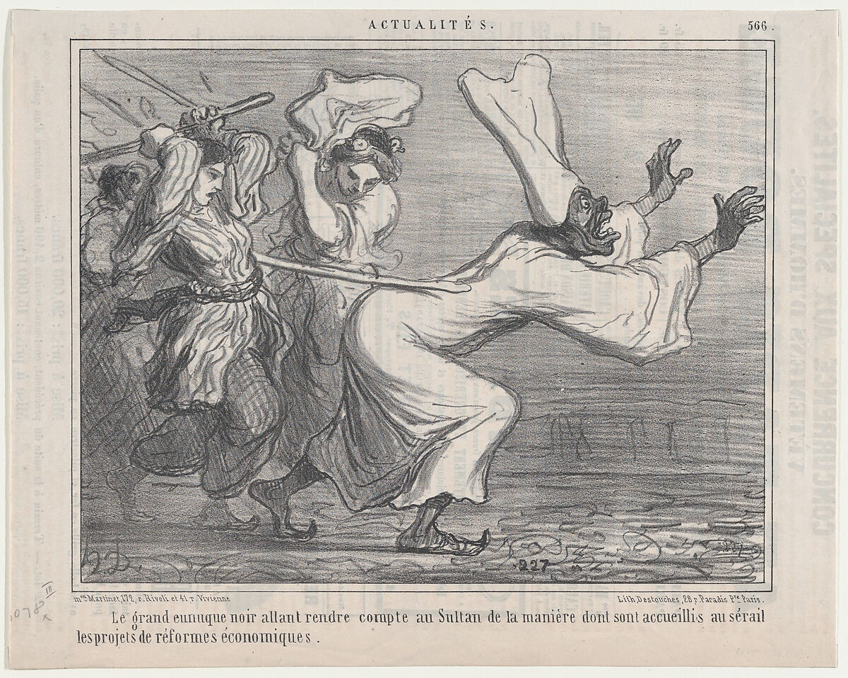 - Title:Le grand eunuque noir allant rendre compte au Sultan..., from Actualités, published in Le Charivari, September 18, 1858
