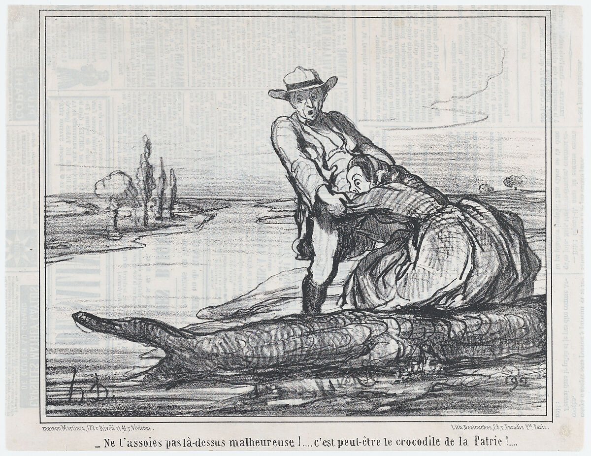 Ne t'assoies pas là-dessus malheureuse!.... c'est peut-être le crocodile de la Patrie!...., from Actualités, published in Le Charivari, July 8, 1858