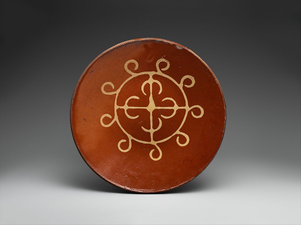 This charger bears slip decoration typical of the pottery from Huntington, New York. Huntington, Long Island, was rich in clay deposits, spawning a number of small wood-fired potteries, the first dating to the late eighteenth or early nineteenth centuries. Their location on Long Island Sound was ideal for transporting their wares by boat to markets in New York City and Connecticut. The bold, symmetrical design was applied with the aid of a tin stamp, which was dipped in slip and pressed onto the slab of clay, a novel technique unique to Huntington.