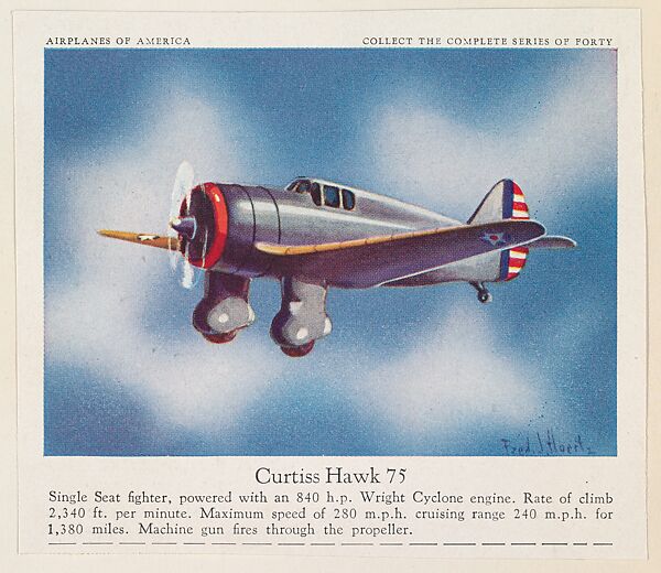 - Title:Curtiss Hawk 75, collector card from the Airplanes of America series (D2), issued by the Kelley Baking Company to promote Kelley's Bread