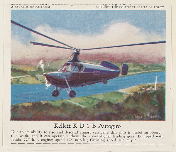 - Title: Kellett K D 1 B Autogiro, collector card from the Airplanes of America series (D2), issued by the Kelley Baking Company to promote Kelley's Bread