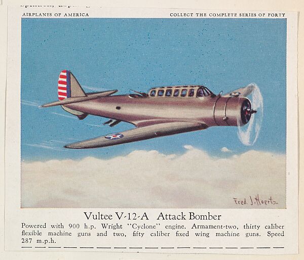 - Title:Vultee V-12-A Attack Bomber, collector card from the Airplanes of America series (D2), issued by the Kelley Baking Company to promote Kelley's Bread