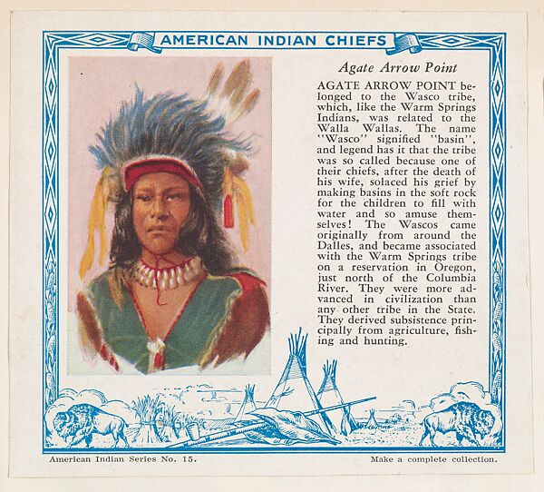 Agate Arrow Point, No. 15, collector card from the American Indian Series (D6), issued by the Kelley Baking Company to promote Kelley's Bread; one of many issuers. These cards were also published as the Indian Chiefs series (T129) by Red Man Tobacco. (Album 307, page 17)