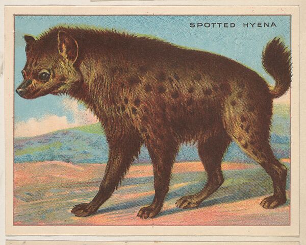 Spotted Hyena, collector card from the Animals series (D9), issued by the Weber Baking Company to promote Onist Milk and Pullman Bread; 80 cards in series. These cards were also published as the Animals series (T29) by Hassan Cigarettes. (Album 307, page 21)