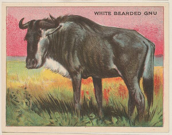 White Bearded Gnu, collector card from the Animals series (D9), issued by the Weber Baking Company to promote Onist Milk and Pullman Bread; 80 cards in series. These cards were also published as the Animals series (T29) by Hassan Cigarettes. (Album 307, page 21)