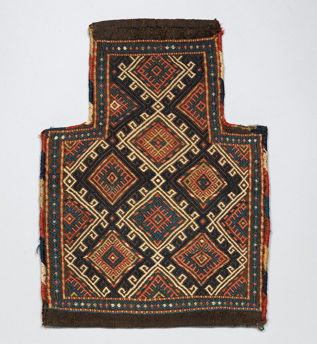 Nomads used small narrow-necked bags to carry salt, which they would add to their food and feed to their grazing animals. Designed in an overall pattern of repeating lozenges, this example stands apart due to its unusual technique: it is made of a plain-weave ground decorated with a pattern in supplementary brocaded weft.