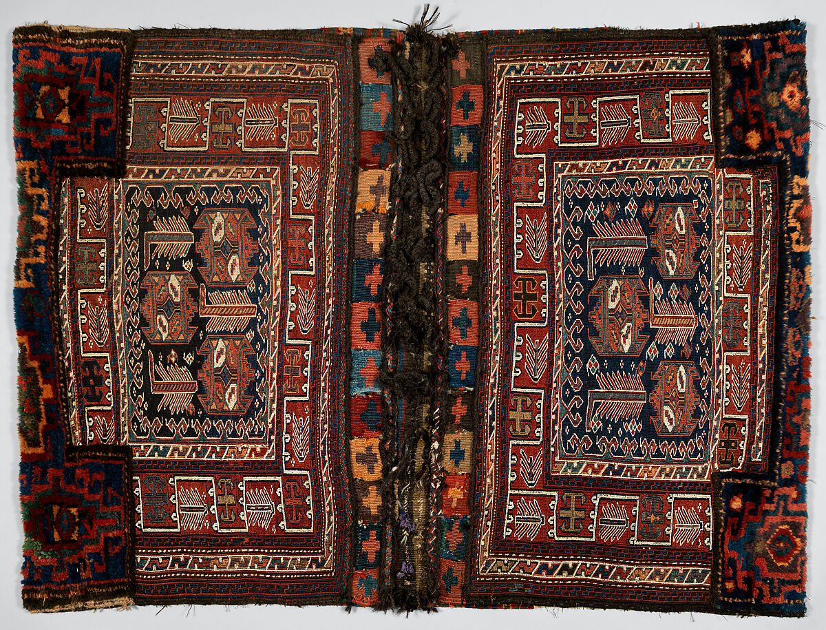 - Medium:Wool (warp, ground weft, sumak weft, and pile) and goat(?) hair (braided loops); sumak extra-weft wrapping, tapestry (kilim) with dovetailing, and border pattern in complementary weft weave (front); symmetrically knotted pile (top and bottom edges); weft-faced plain weave with two areas of pattern in sumak extra-weft wrapping with twined and braided loop closures (back)