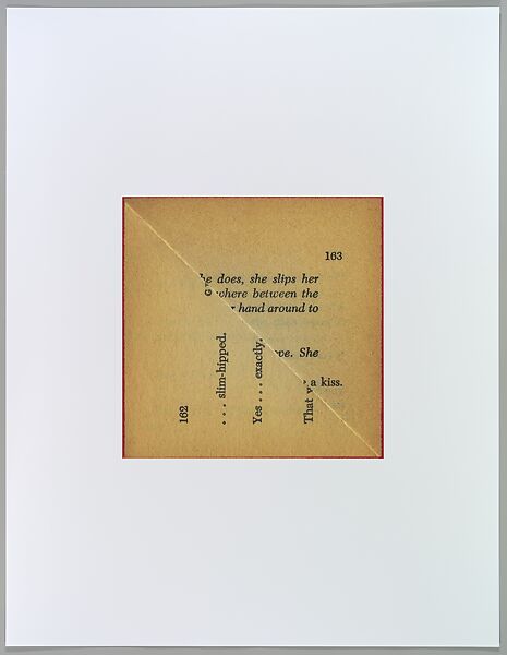 In Baum’s series Dog’s Ear, the act of turning down a page corner becomes a fruitful vein to tap into, with the reader’s act of remembering his or her place standing in for the kind of collective historical memory that books epitomize. The artist’s chance alignments create readymade poetry that can be read in multiple directions and configurations; the play of verbal and visual signs becomes the raw material of the work of art that is a carefully calibrated mix of chance and intention.