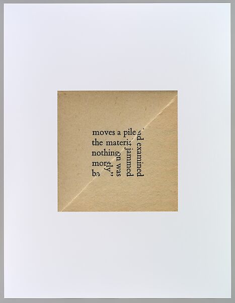 In Baum’s series Dog’s Ear, the act of turning down a page corner becomes a fruitful vein to tap into, with the reader’s act of remembering his or her place standing in for the kind of collective historical memory that books epitomize. The artist’s chance alignments create readymade poetry that can be read in multiple directions and configurations; the play of verbal and visual signs becomes the raw material of the work of art that is a carefully calibrated mix of chance and intention.