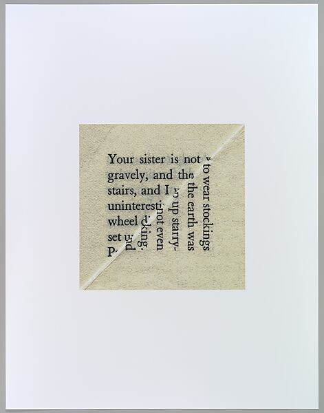 In Baum’s series Dog’s Ear, the act of turning down a page corner becomes a fruitful vein to tap into, with the reader’s act of remembering his or her place standing in for the kind of collective historical memory that books epitomize. The artist’s chance alignments create readymade poetry that can be read in multiple directions and configurations; the play of verbal and visual signs becomes the raw material of the work of art that is a carefully calibrated mix of chance and intention.