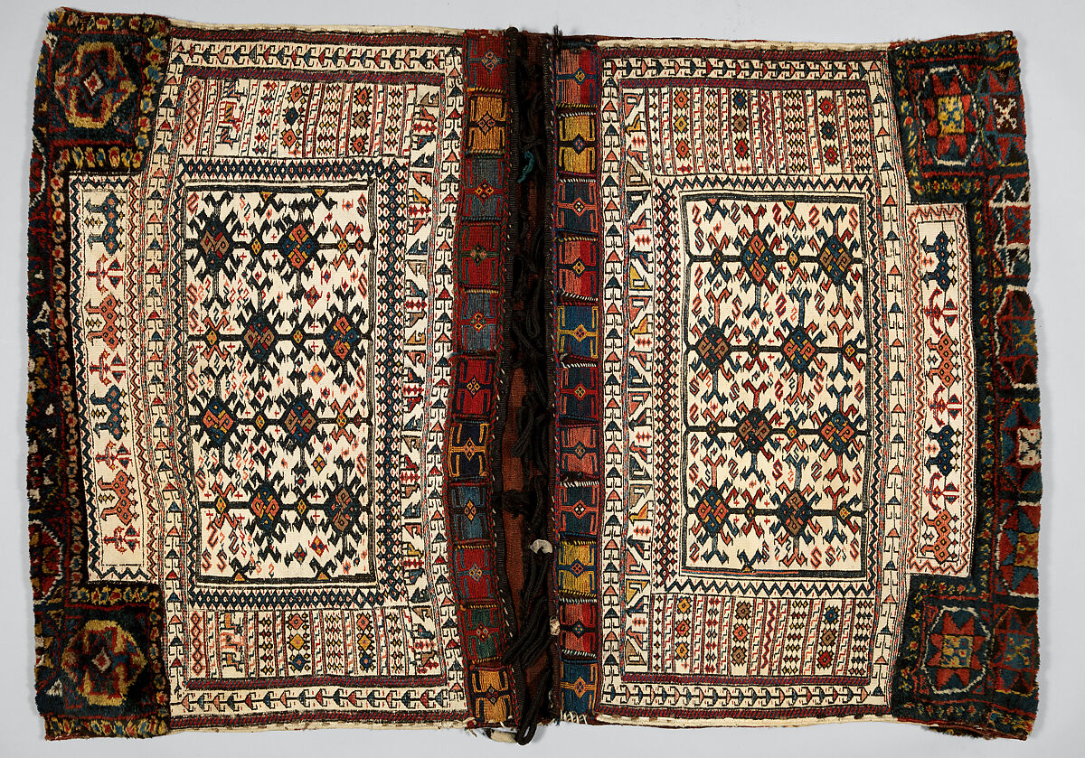 The large double flour bags created by Bakhtiari weavers usually feature pile with symmetrical knots at the bottom to protect the bag in areas of extreme wear. Unlike the other Bakhtiari double flour bag on view (MMA 2015.490.8), the ground here is executed in weft-faced plain weave using white cotton, and the patterning is made in sumak extra-weft wrapping with wool threads. The weaver chose to decorate the bag with repeating lozenges and other geometric motifs, as well as stylized human figures and animals.