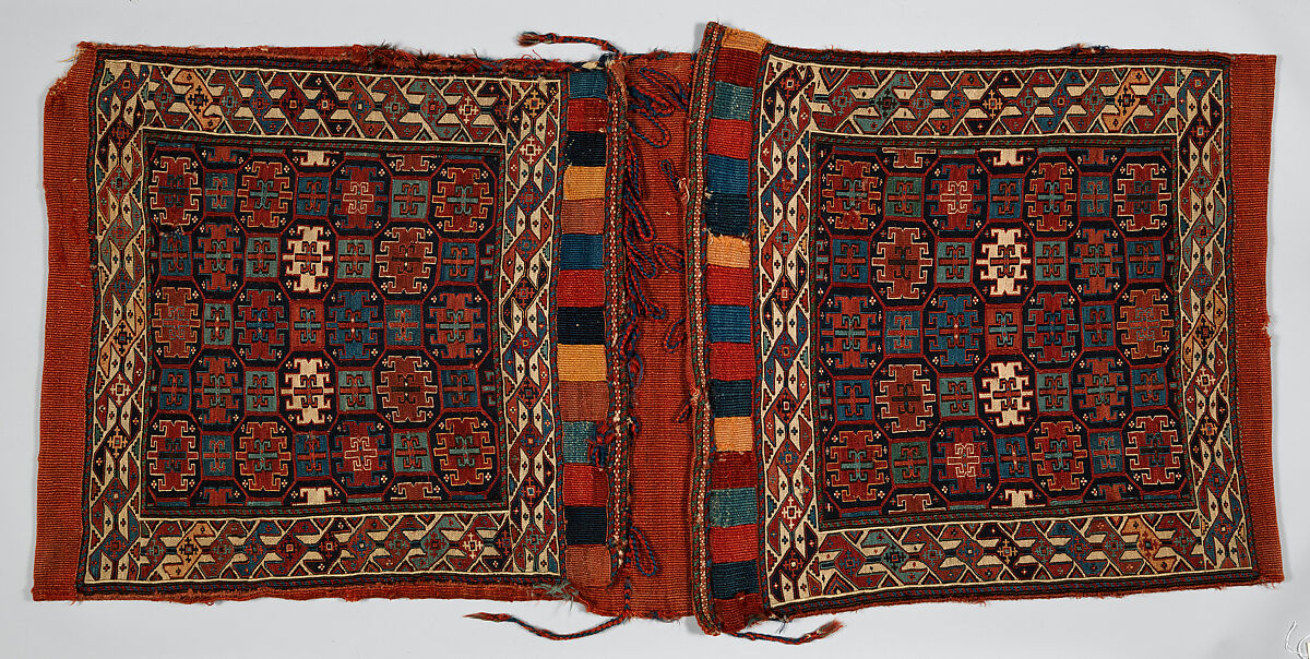 Many Shahsevan weavings from the nineteenth and twentieth centuries, especially those with centralized geometric designs, show a striking relationship with Anatolian carpets from the fifteenth and sixteenth centuries. These older textiles are called Memling carpets, after the fifteenth-century Netherlandish painter who depicted them in his religious works. The khorjin saddlebags, such as this piece, continue the Memling design: it features repeated geometric octagonal medallion motifs with stars and angular hooks that develop from the step-like edges. Many of the motifs found on Shahsevan textiles are thought to be centuries-old tribal emblems, a symbolic language that today we are frequently unable to decipher.
