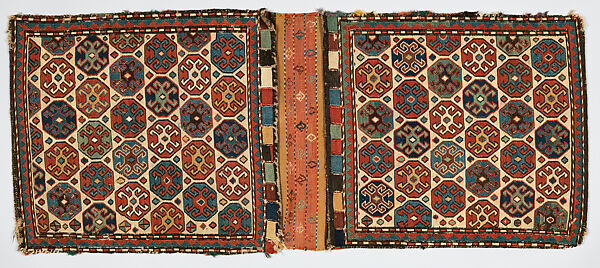 Many Shahsevan weavings from the nineteenth and twentieth centuries, such as this example, show a striking relationship with Anatolian carpets from the fifteenth and sixteenth centuries. These older textiles are called Memling carpets, after the fifteenth-century Netherlandish painter who depicted them in his religious works. The khorjin saddlebags, such as this piece, continue the Memling design: it features repeated geometric octagonal medallion motifs with stars and angular hooks that develop from the step-like edges. Many of the motifs found on Shahsevan textiles are thought to be centuries-old tribal emblems, a symbolic language that today we are frequently unable to decipher.