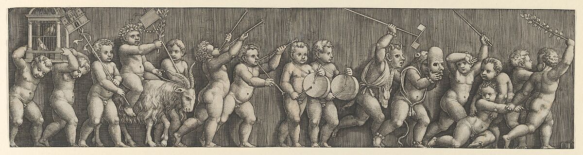 - Title: A frieze arrangement with a putto weating a laurel crown riding a goat at left and many infants playing musical instruments in front